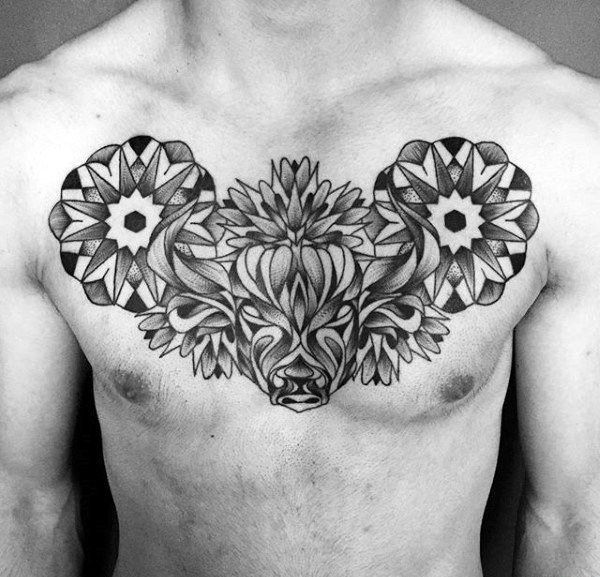 男性胸前霸气的大牛头纹身图案