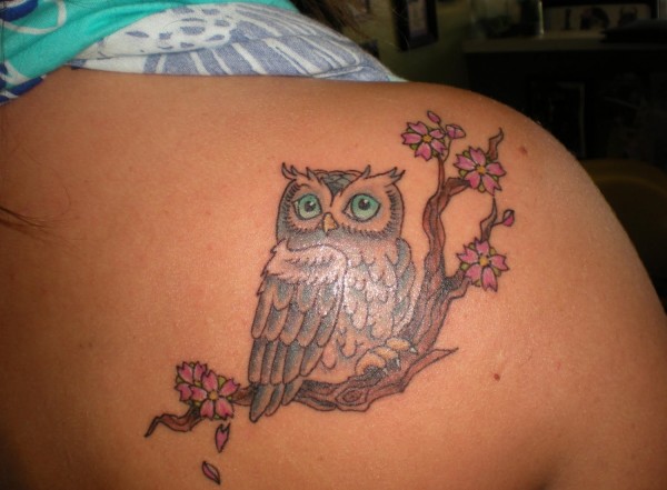 女孩后肩背上漂亮的树枝花和猫头鹰纹身图案