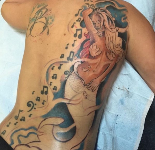 漂亮性感女孩身上美丽的美人鱼纹身图案鱼