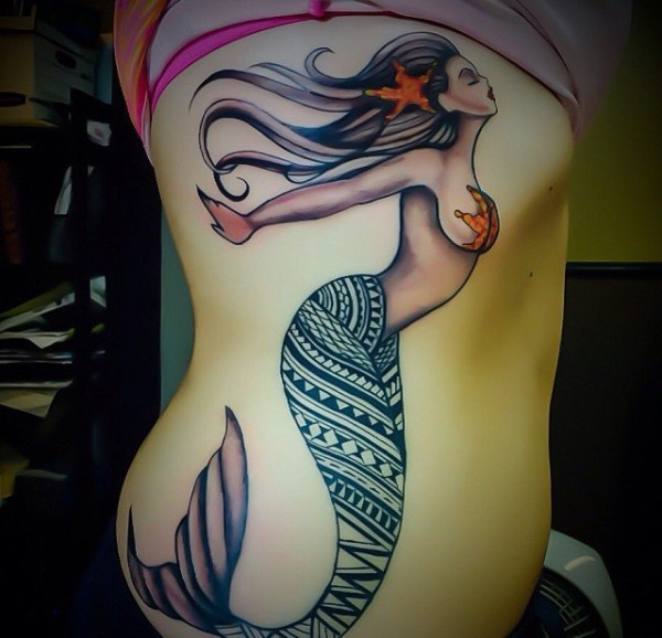 漂亮性感女孩身上美丽的美人鱼纹身图案鱼