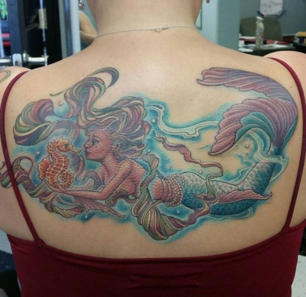 漂亮性感女孩身上美丽的美人鱼纹身图案鱼