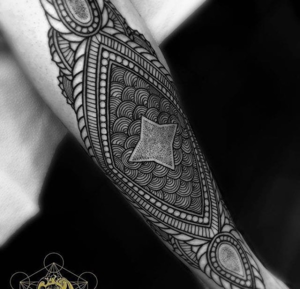 手臂上精美的黑色装饰风格曼陀罗纹身图案来自柯克
