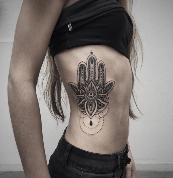 性感漂亮的女性侧肋上个性的纹身图案