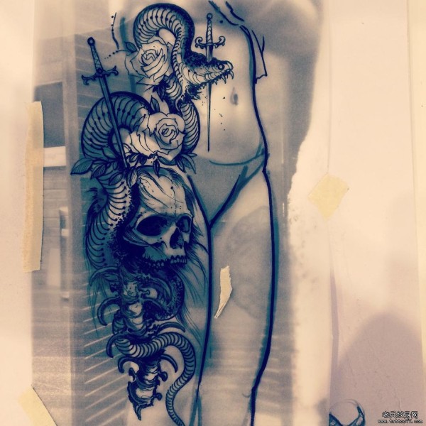 school欧美蛇骷髅玫瑰纹身图案手稿