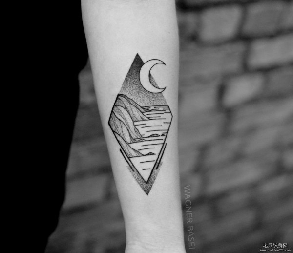 小臂几何点刺月亮风景线条纹身图案