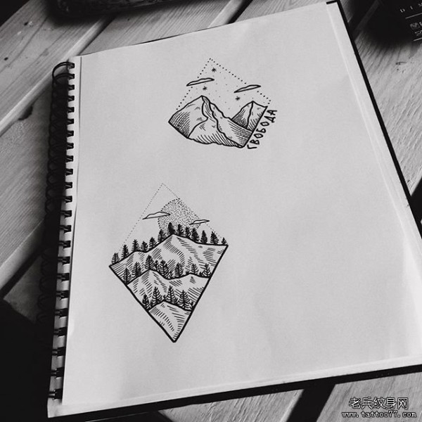 小清新线条点刺几何山脉风景纹身图案手稿
