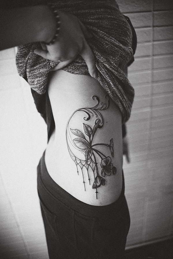 女生后腰纹身黑白灰风格抽象线条纹身图案