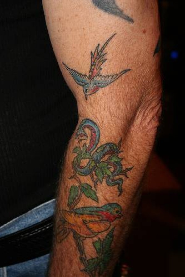 手臂彩色鸟和蛇oldschool纹身