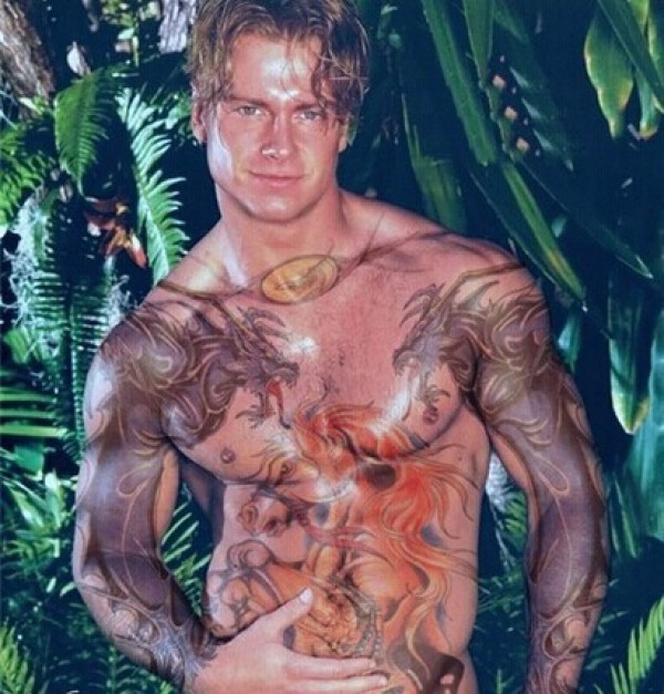 欧美男生胸部彩绘骏马和手臂龙纹身图案