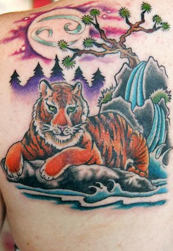 肩部彩色老虎纹身图案