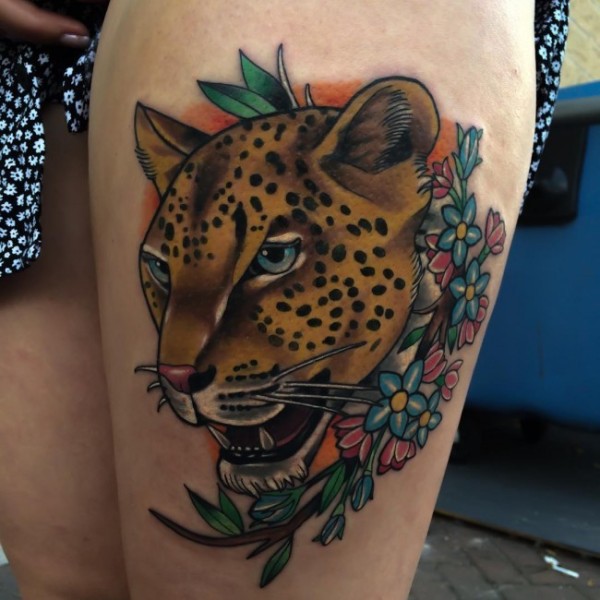 腿部彩色豹头纹身图案