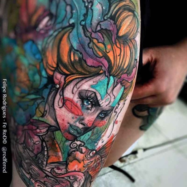 腿部彩色女人纹身图案