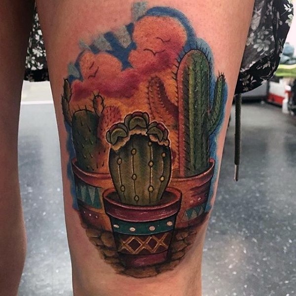 腿部彩色仙人掌纹身图片