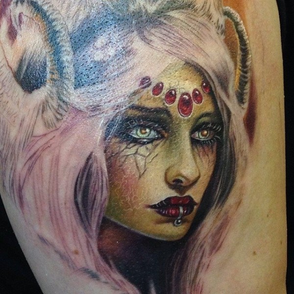腿部恶魔般的女人纹身图案