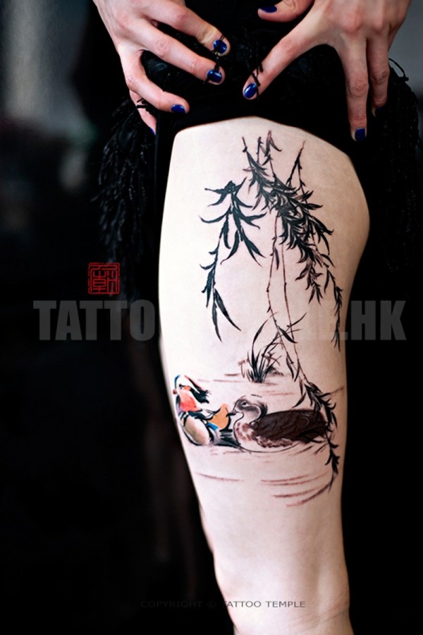 腿部水彩鸭子纹身图案