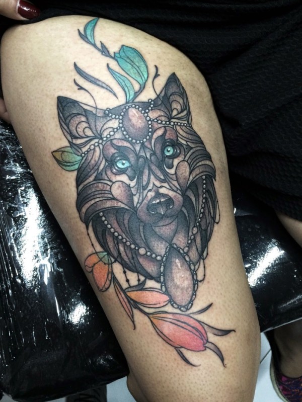 腿部彩色狼纹身图片