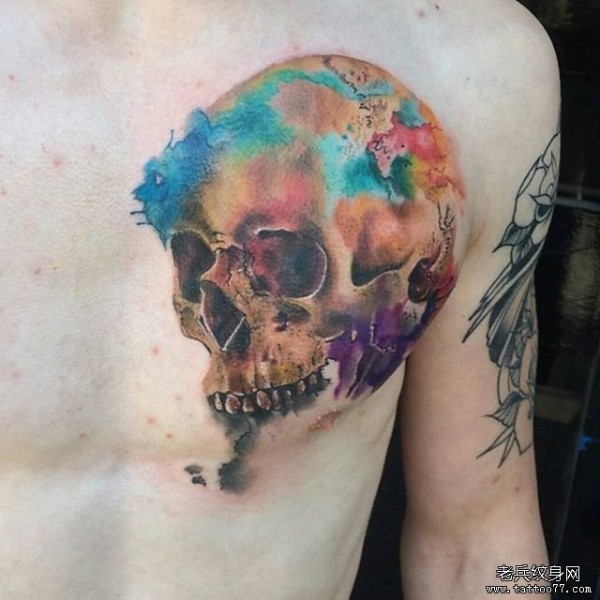 胸部骷髅泼墨彩绘tattoo纹身图案