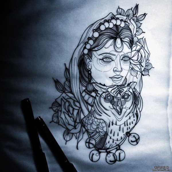 欧美school女郎猫头鹰铃铛玫瑰纹身图案手稿