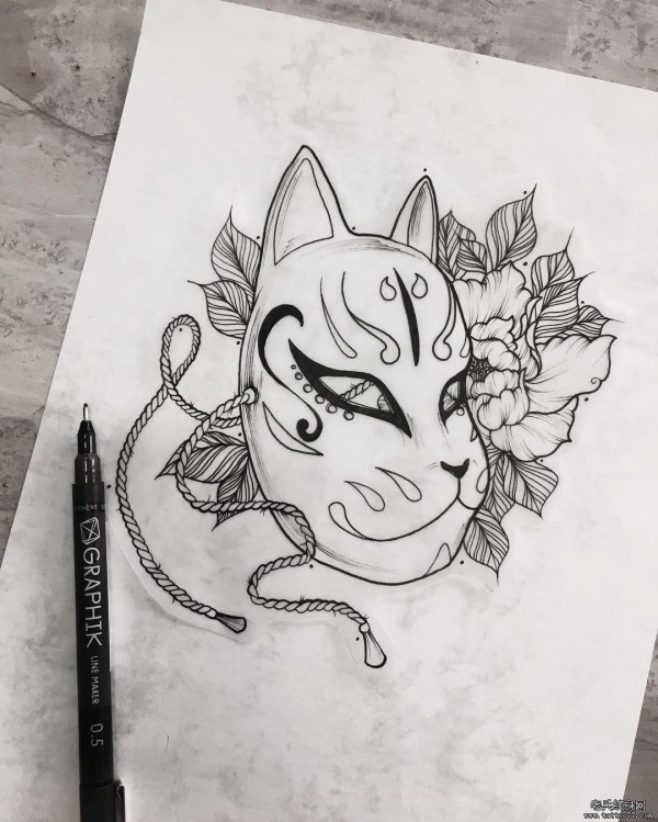 欧美猫面具花卉个性纹身图案手稿