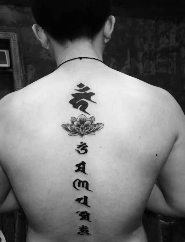 莲花与梵文一起的背部脊椎纹身图案