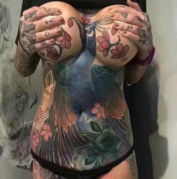 大胸美女胸部腹部孔雀花蕊纹身图案很性感