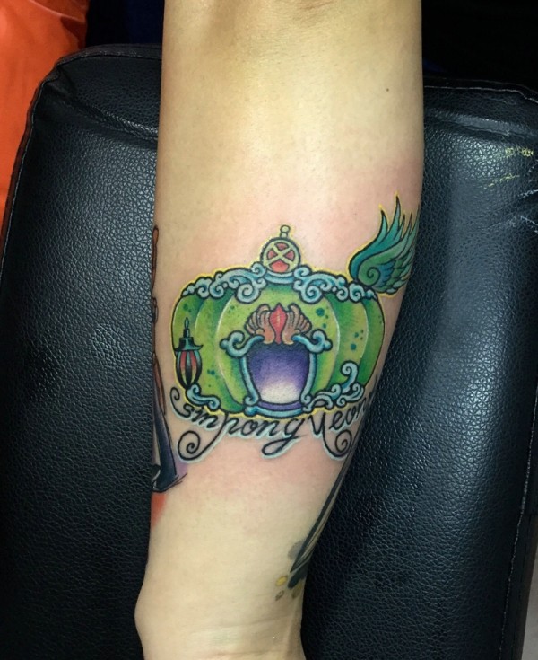 手臂一款彩色鲜艳的皇冠字母纹身图案