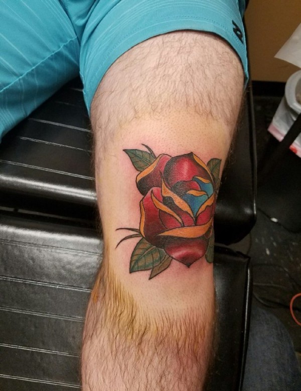 男性膝盖上漂亮的红色玫瑰花朵纹身图案
