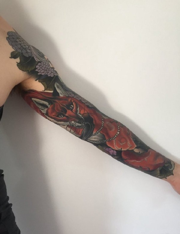 男性左手花臂漂亮的女性花朵和狐狸纹身图案