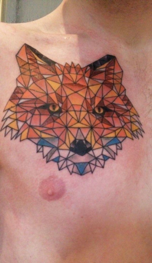 男子右胸部上个性的几何三角形狐狸纹身图片