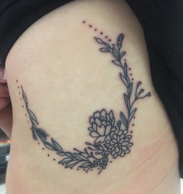 女性侧肋上漂亮的弯月形状藤蔓小花纹身图片