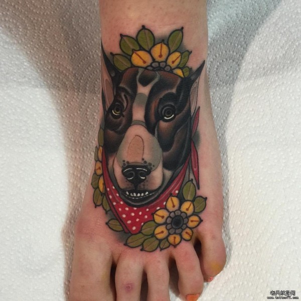 脚背school彩绘狗花卉纹身图案