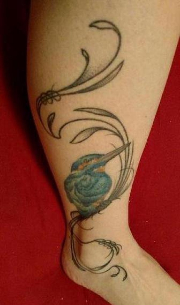 小腿上的水草和翠鸟纹身图片