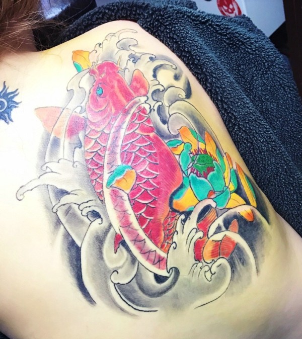 背部彩绘鲤鱼浪花莲花纹身图案很抢眼