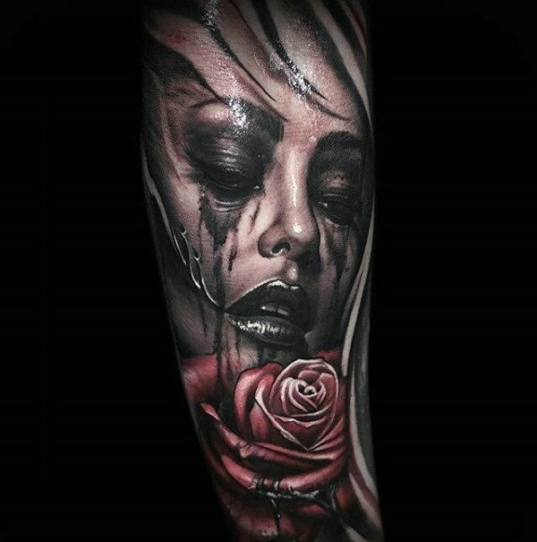 手臂辣眼睛的3d玫瑰与美女肖像纹身图案