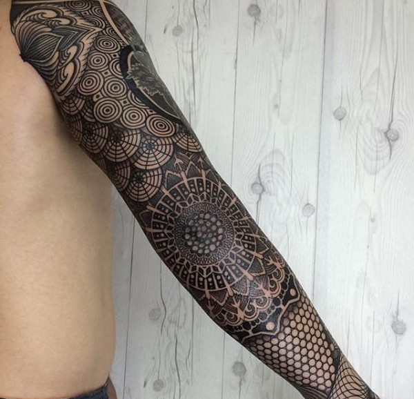 黑色的时尚花臂纹身几何花腿纹身图案