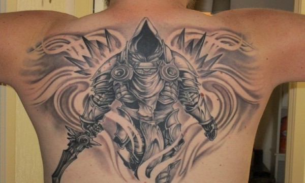 男性后背黑灰色霸气的大面积钢铁武士纹身图片