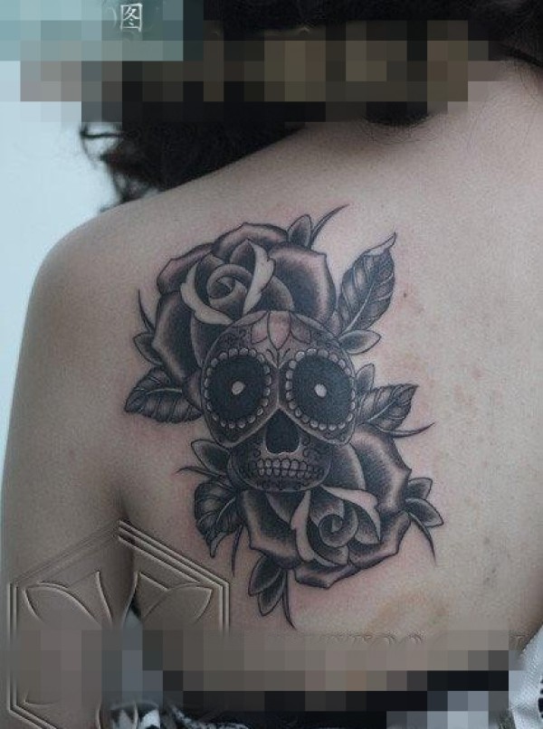 女生肩背唯美的黑灰骷髅与玫瑰花纹身图案