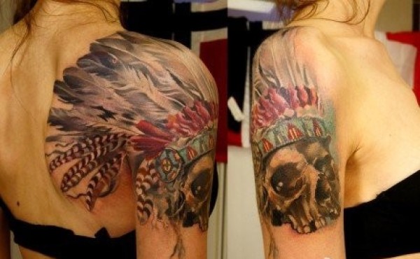 女生手臂到肩背超酷的印第安骷髅纹身图案