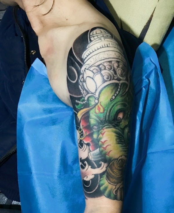 经典耐看的彩色花臂象神纹身图案