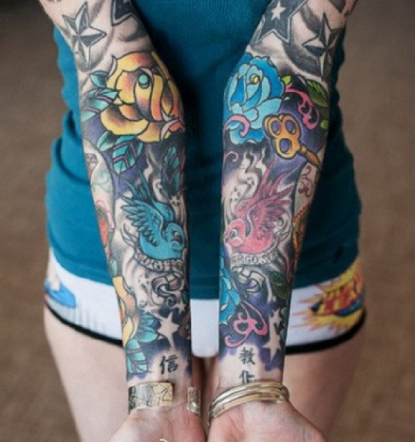 两只手臂彩绘花蕊鸟钥匙纹身图案
