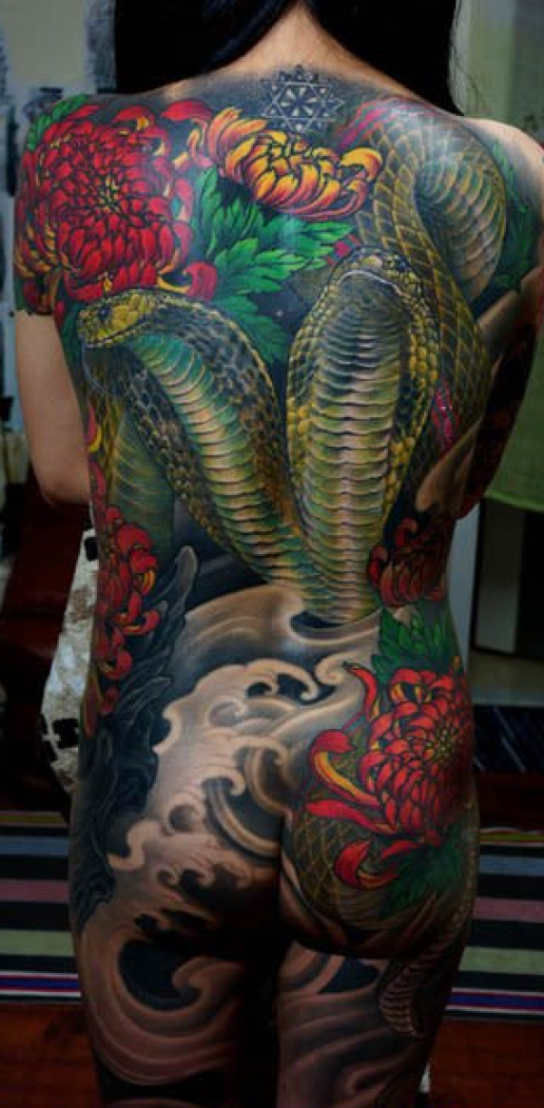 美女满背臀部腿部菊花双头眼镜蛇纹身图案