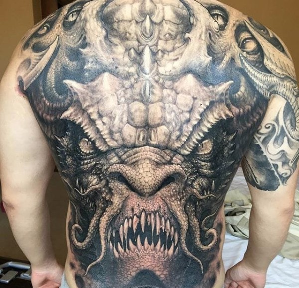 黑灰色大面积纹身龙头和斗战胜佛纹身图案