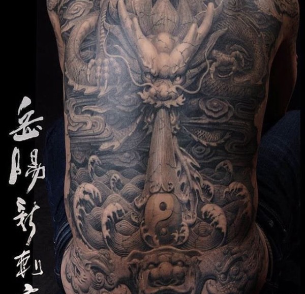 黑灰色大面积纹身龙头和斗战胜佛纹身图案