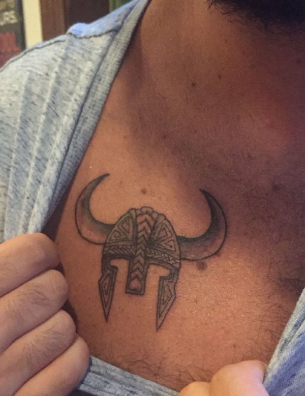 男性右胸部上黑色的牛角武士头盔纹身图案