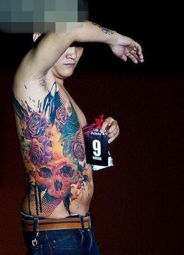 男人侧腰超酷帅气的彩色骷髅与玫瑰花纹身图案