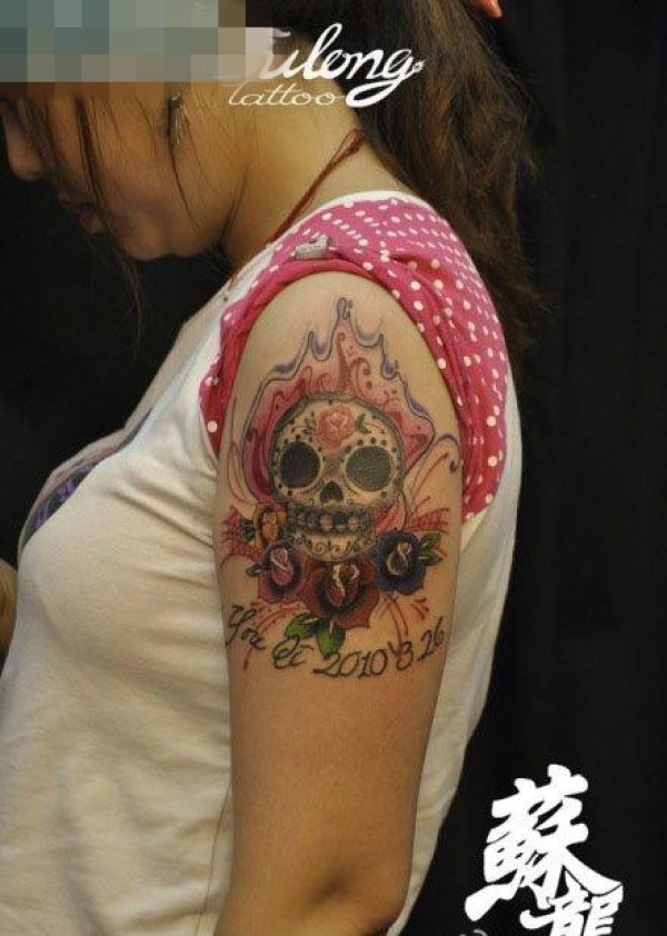 女生手臂经典潮流的骷髅与玫瑰花纹身图案