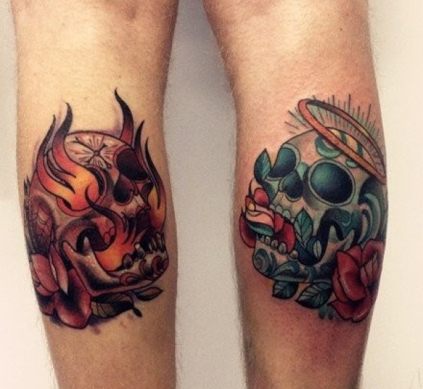 腿部漂亮潮流的情侣欧美骷髅纹身图案