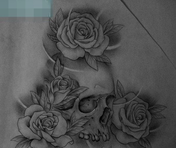 黑灰色玫瑰花和骷髅头纹身图片手稿