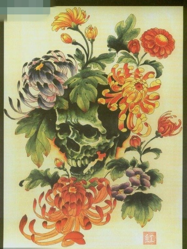 一张漂亮潮流的彩色骷髅与菊花纹身图案