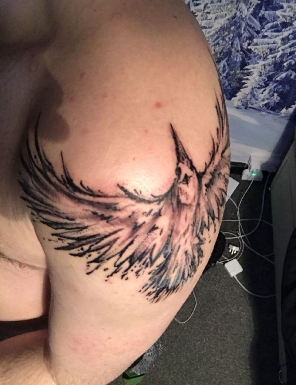 男性左手臂上黑色三只眼乌鸦纹身动物图案纹身